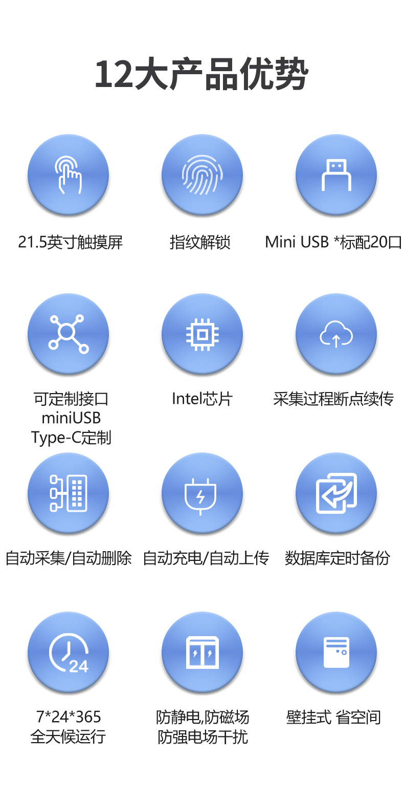 21.5英寸触摸屏,方便操作,指纹识别开锁,采集接口和舱位可定制,明确权限管理,安全系数高,自动采集上传、储存管理